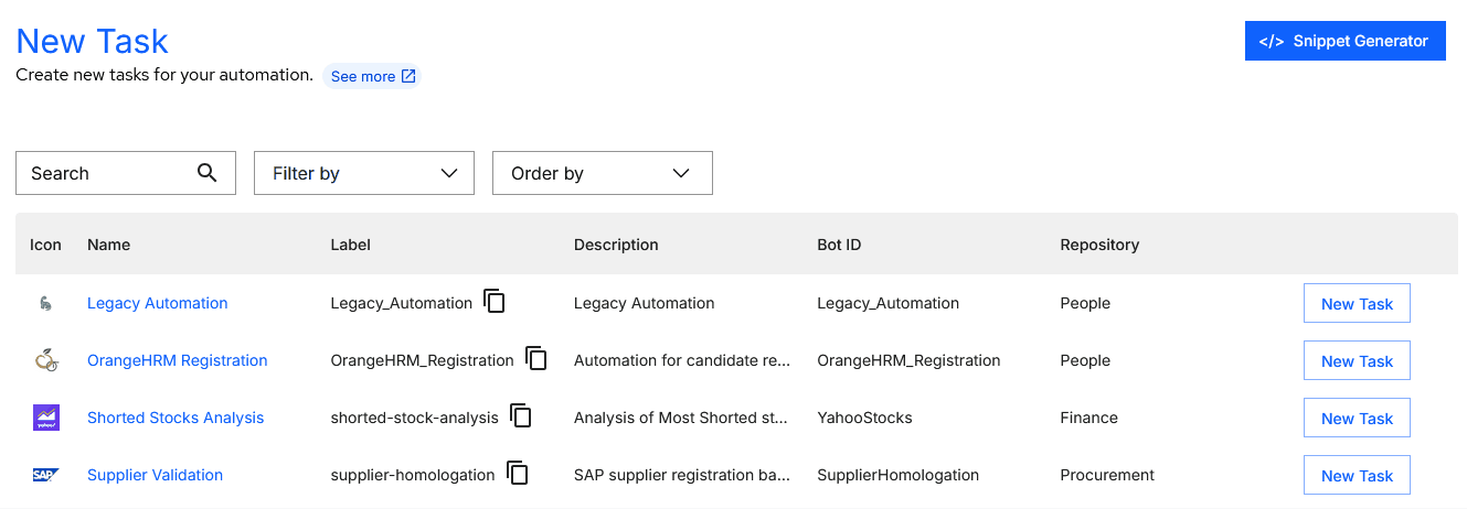 Al acceder al menú Nueva Tarea, puedes visualizar una tabla con todas las automatizaciones creadas en el Orquestador BotCity.