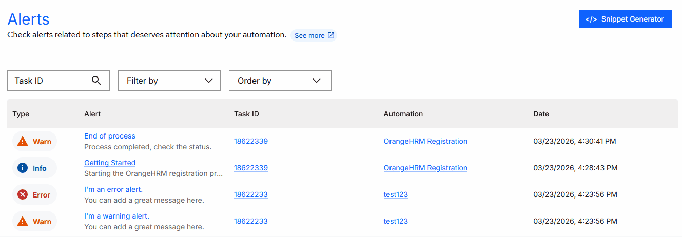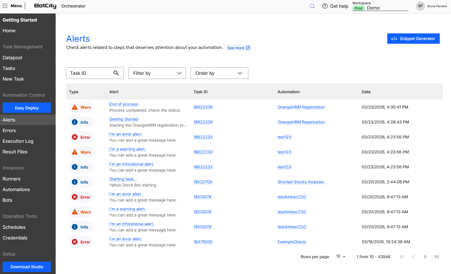 Explore the Snippet Generator button to get code examples that facilitate alert manipulations using the BotCity Maestro SDK. Generate code snippets for the following actions: Informational alert, Warning alert, Error alert and Messages via code.