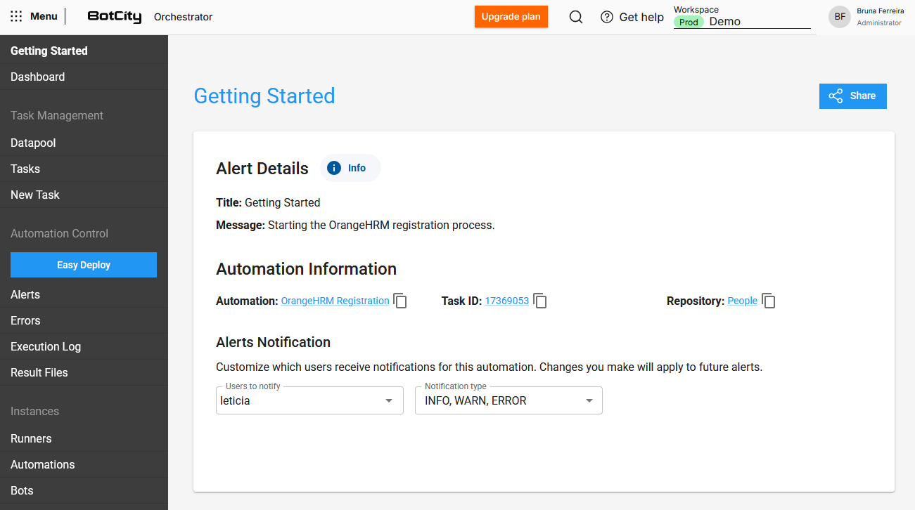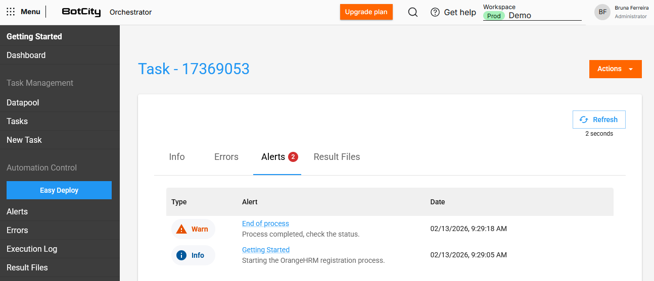 These alerts are recorded in the BotCity Orchestrator, always linked to a specific task.