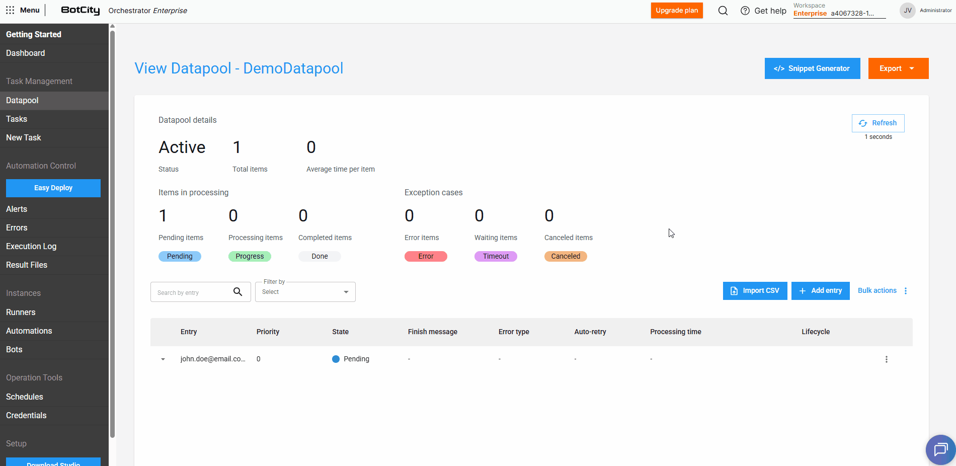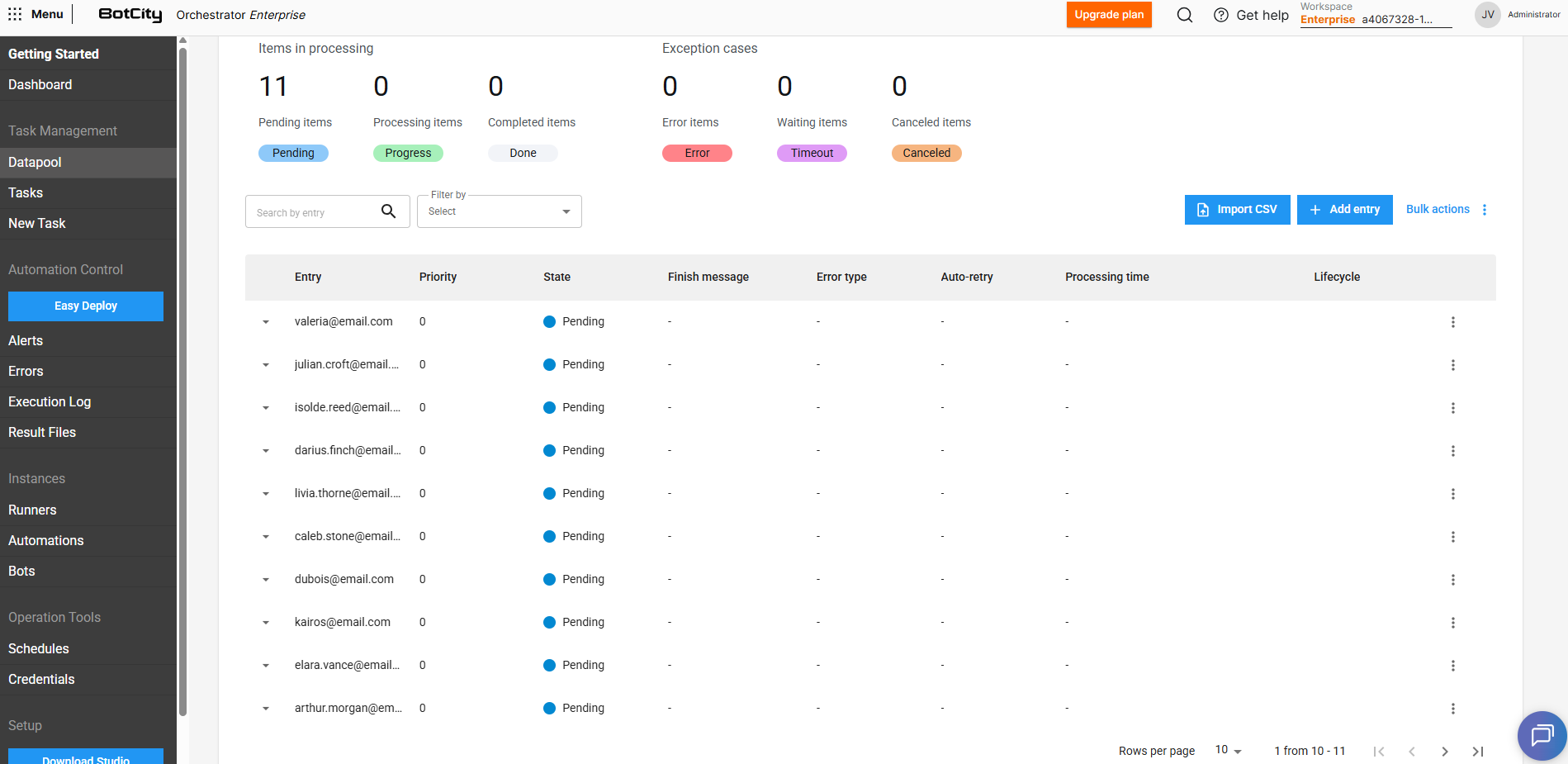 After adding items to the Datapool, they will remain pending in the queue awaiting processing.
