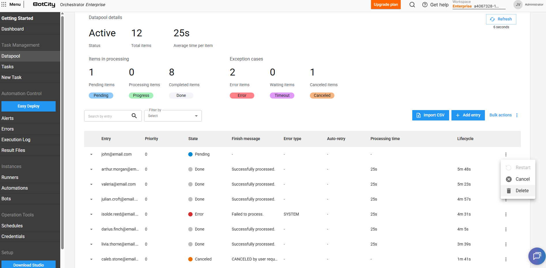). In this case, the item will be ignored during queue consumption. - Delete: Removes the item from the queue and Datapool history. It is not possible to delete items that are in