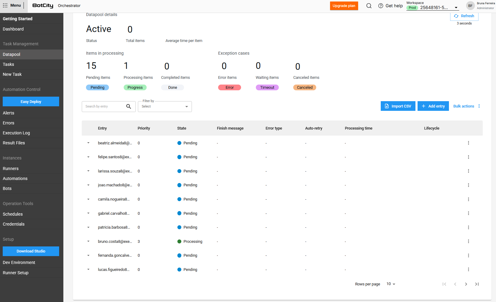 Each Datapool item has various information that can be viewed directly on the BotCity Orchestrator platform.