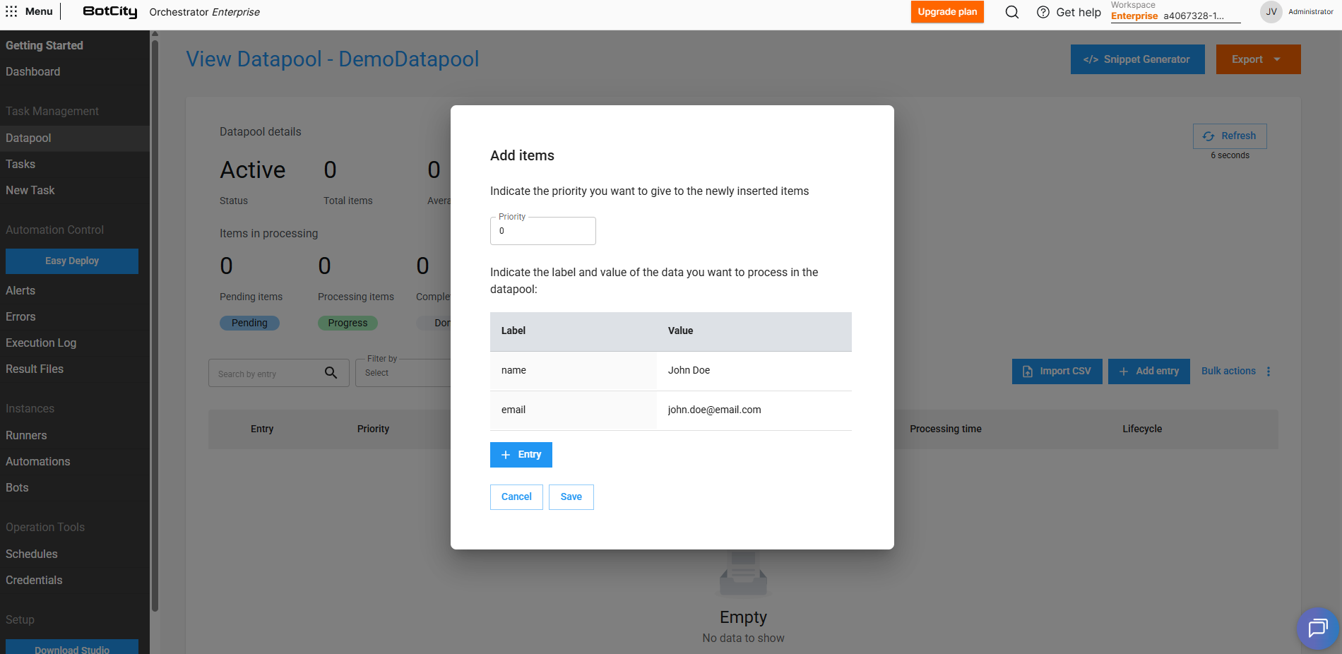 You can also add new items to the Datapool via code, through the BotCity Maestro SDK or using the BotCity Maestro API.