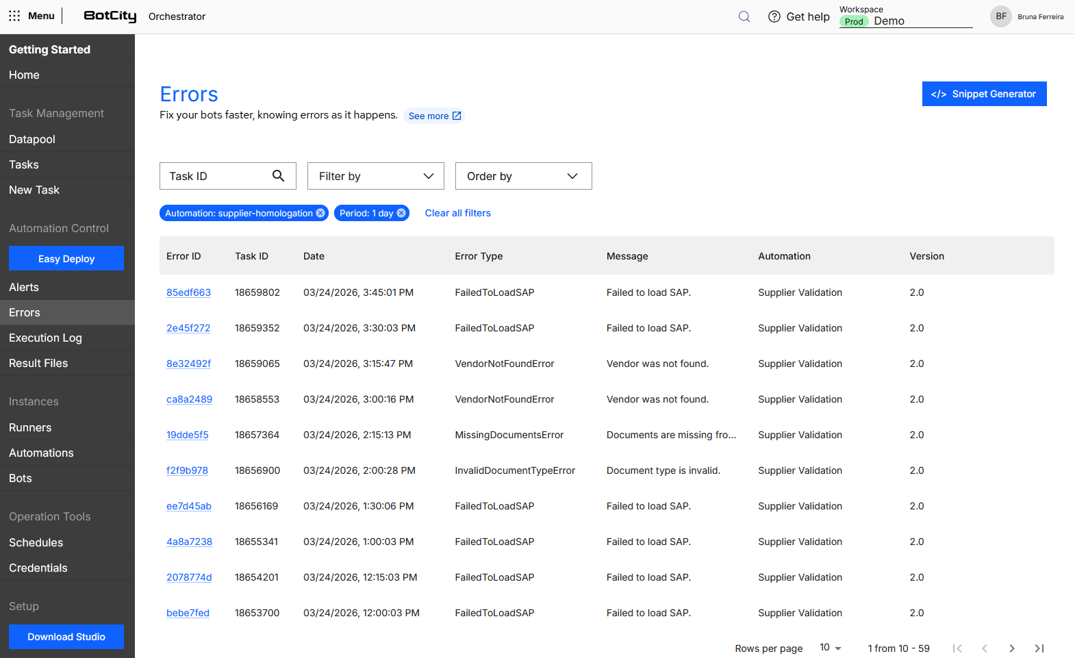When accessing Errors in the side menu, you will find all errors triggered in the Orchestrator in table format.