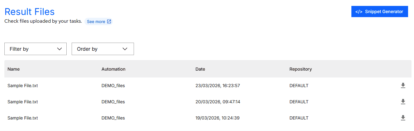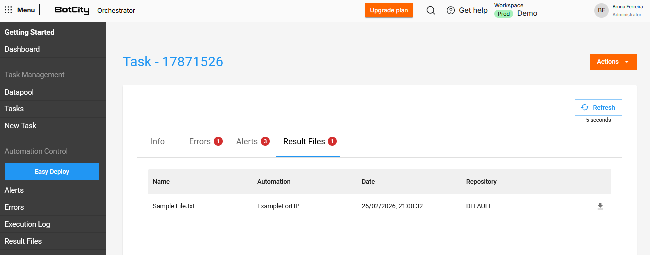 As ações de manipulação de arquivos de resultado podem ser realizadas diretamente na plataforma do Orquestrador BotCity ou via código, utilizando o BotCity Maestro SDK ou a BotCity Orquestrador API.